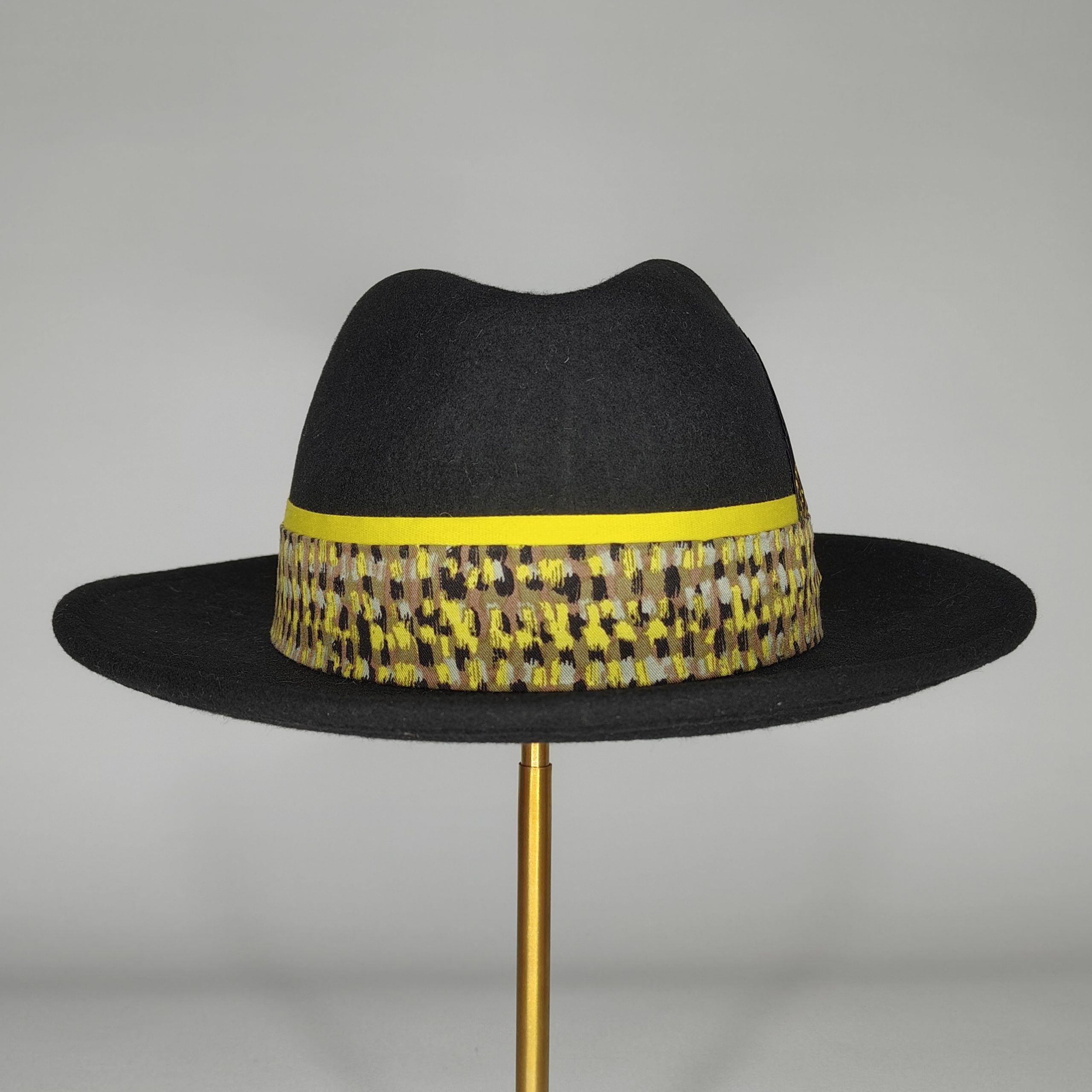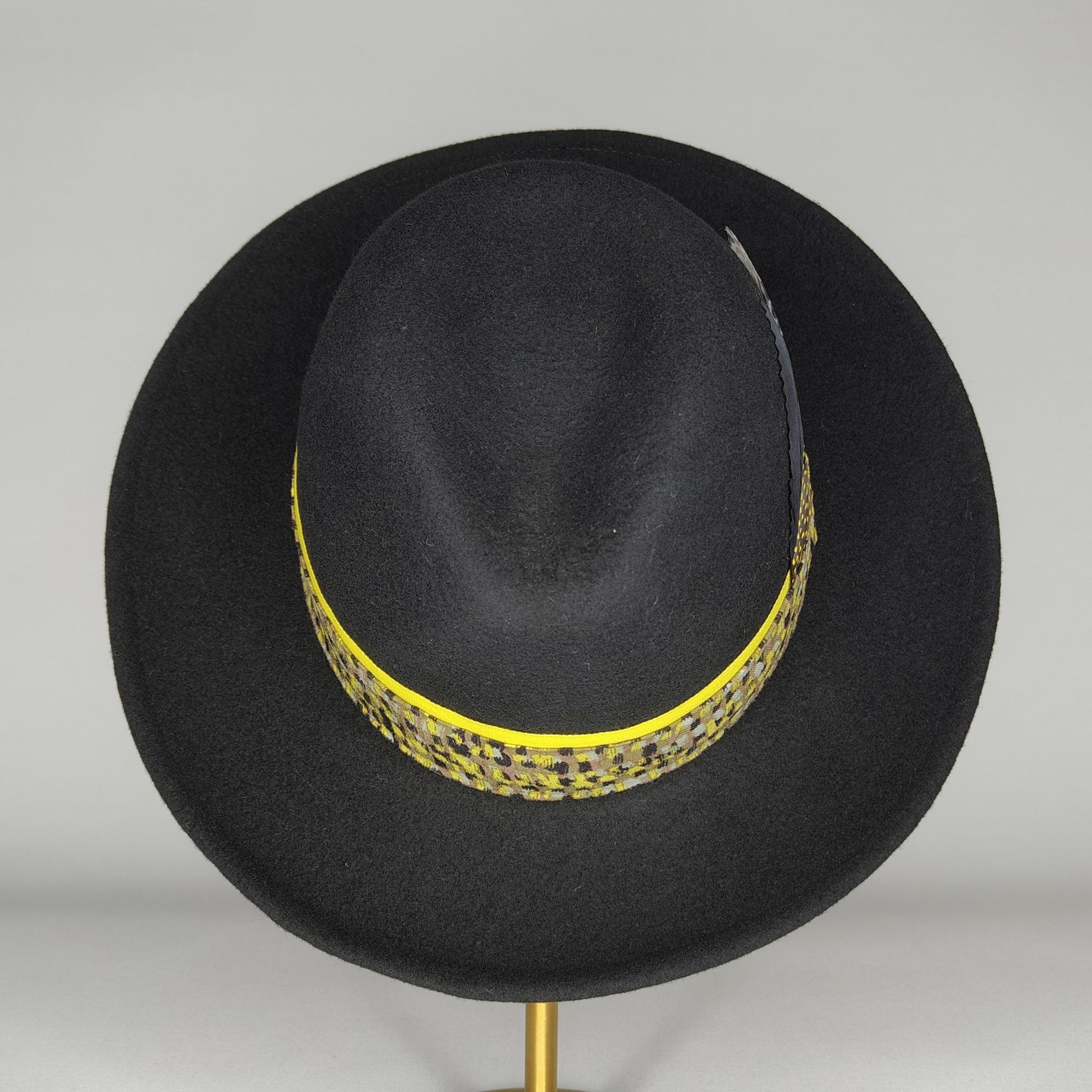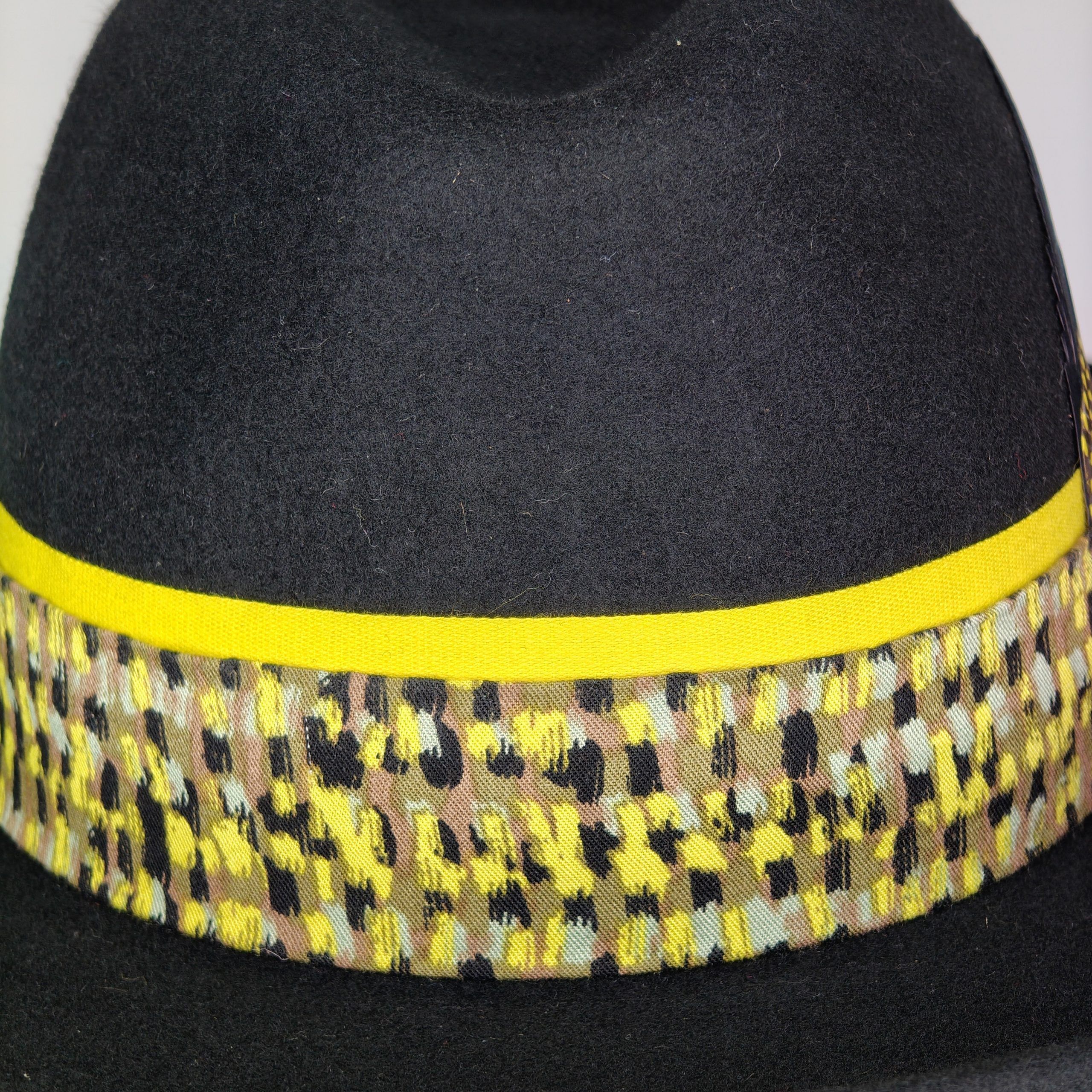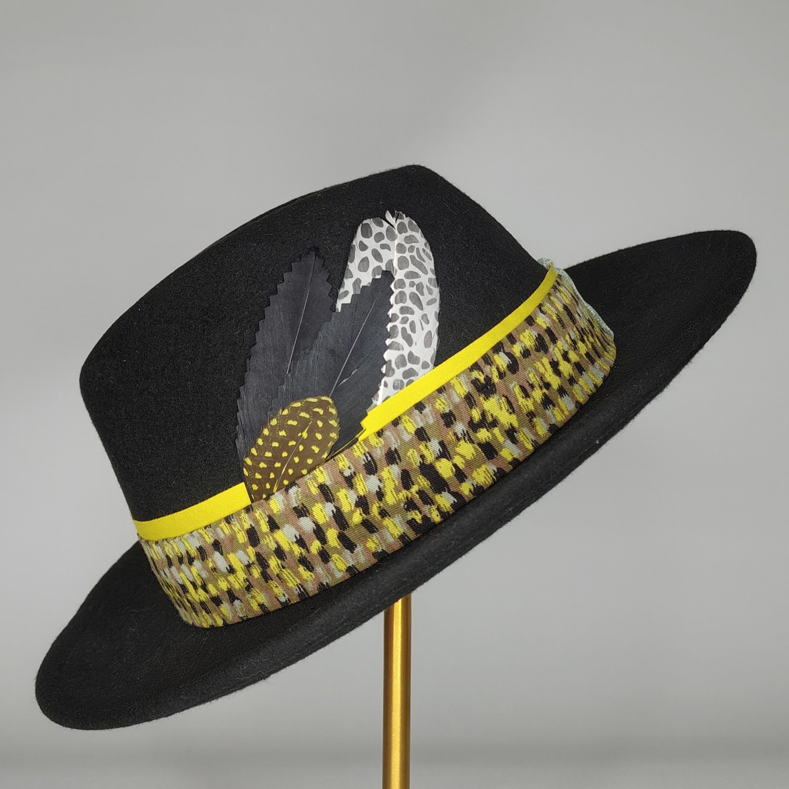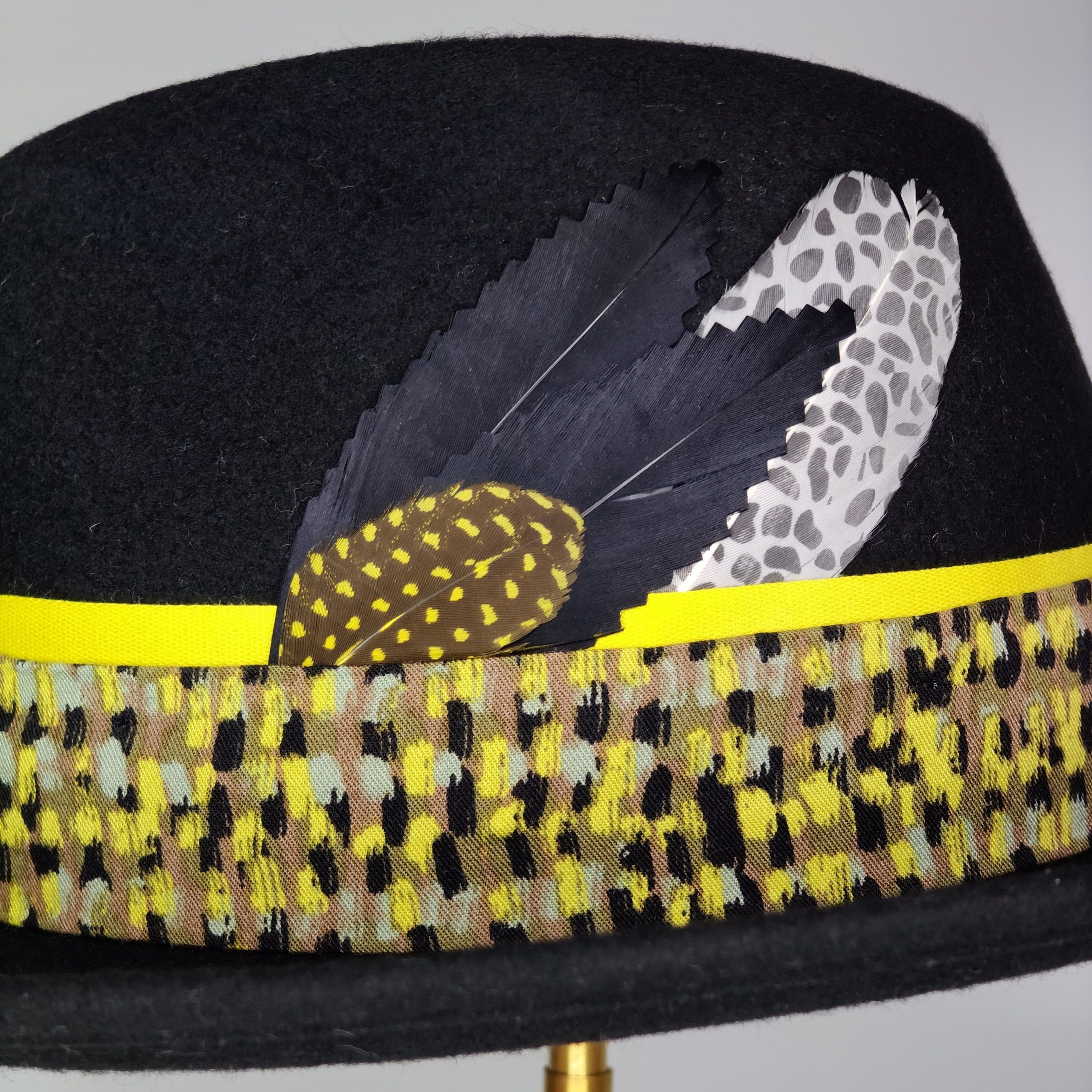 Color negro y decorado con cinta moteada en diferentes tonos, vivo amarillo y combinación de plumas naturales. Altura de la copa 11 cm, ancho de ala 6,5 cm (medidas siempre aproximadas).