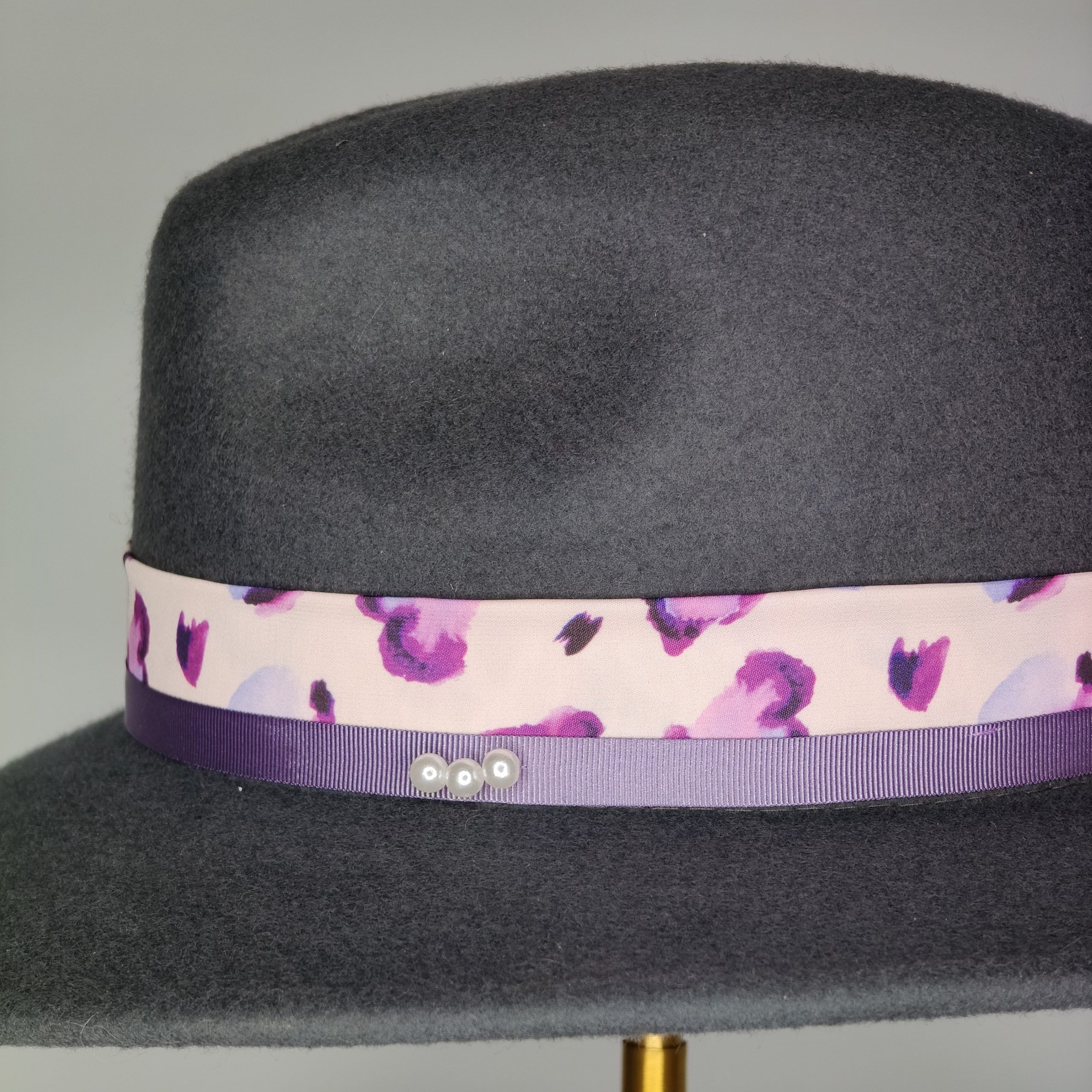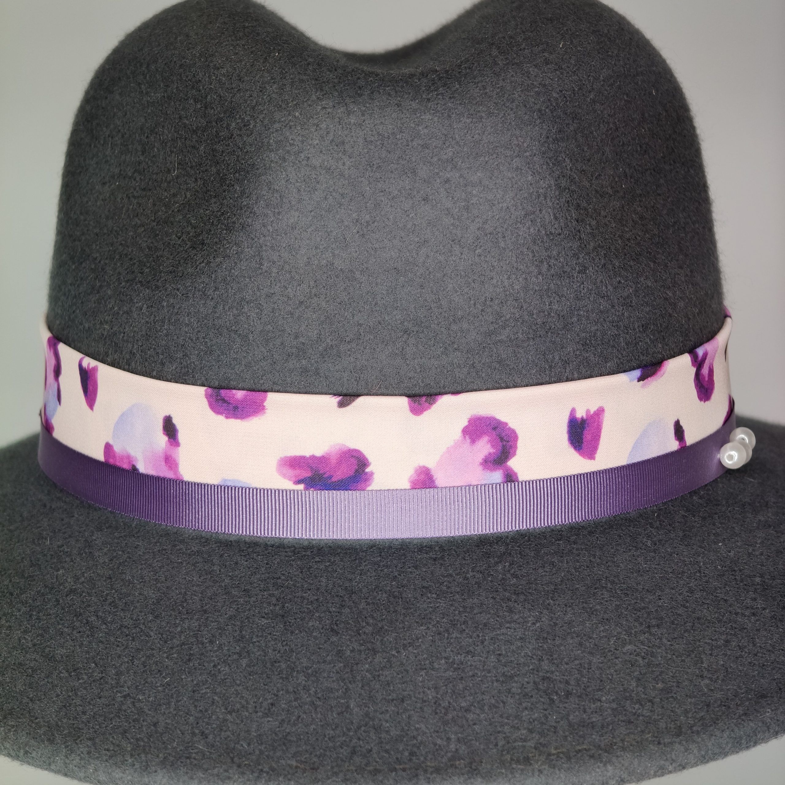 Color gris y decorado con combinación de cintas en tonos lilas.