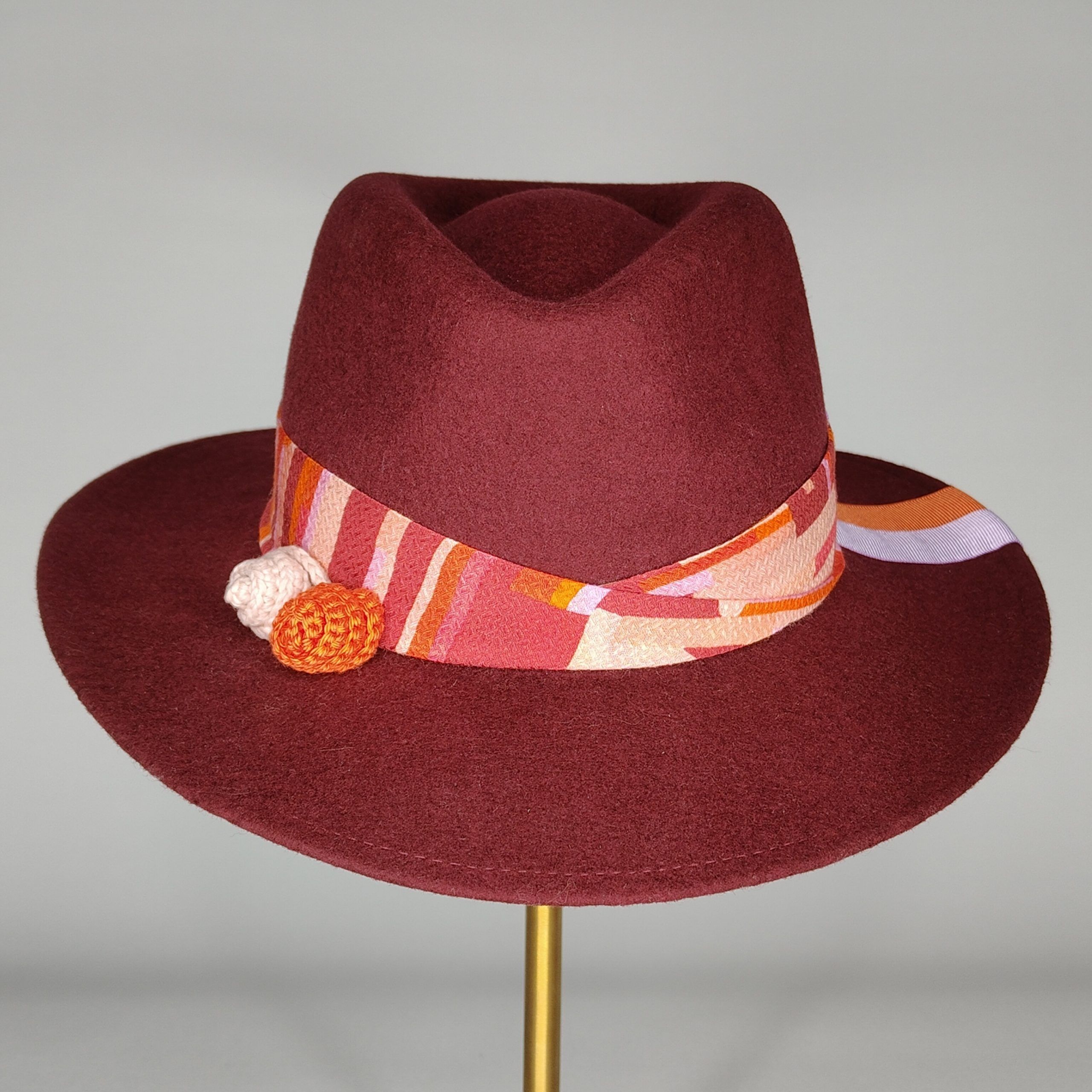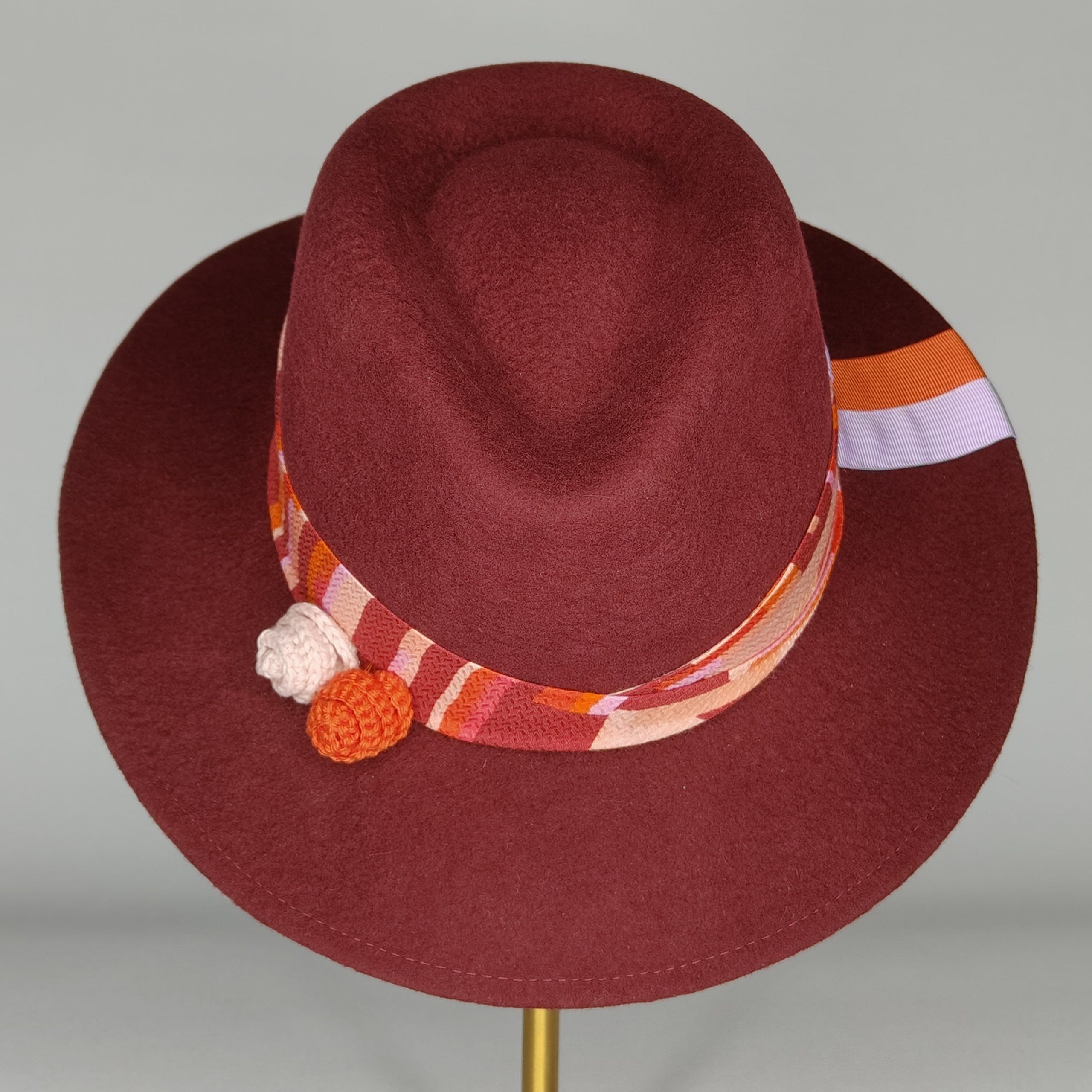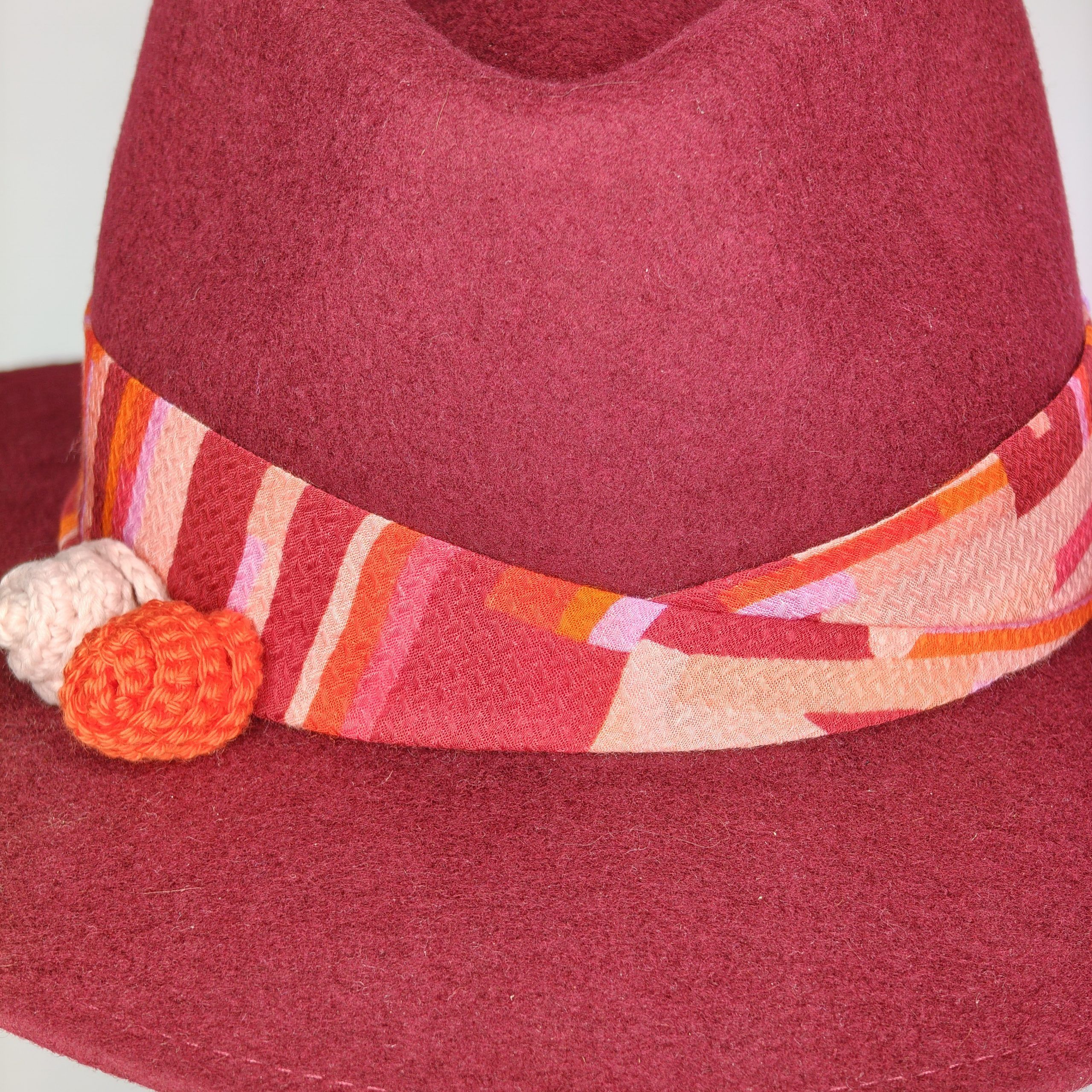 Color burdeos y decorado con combinación de flores de crochet tejidas a mano y contas en tonos lila, naranja y burdeos.
