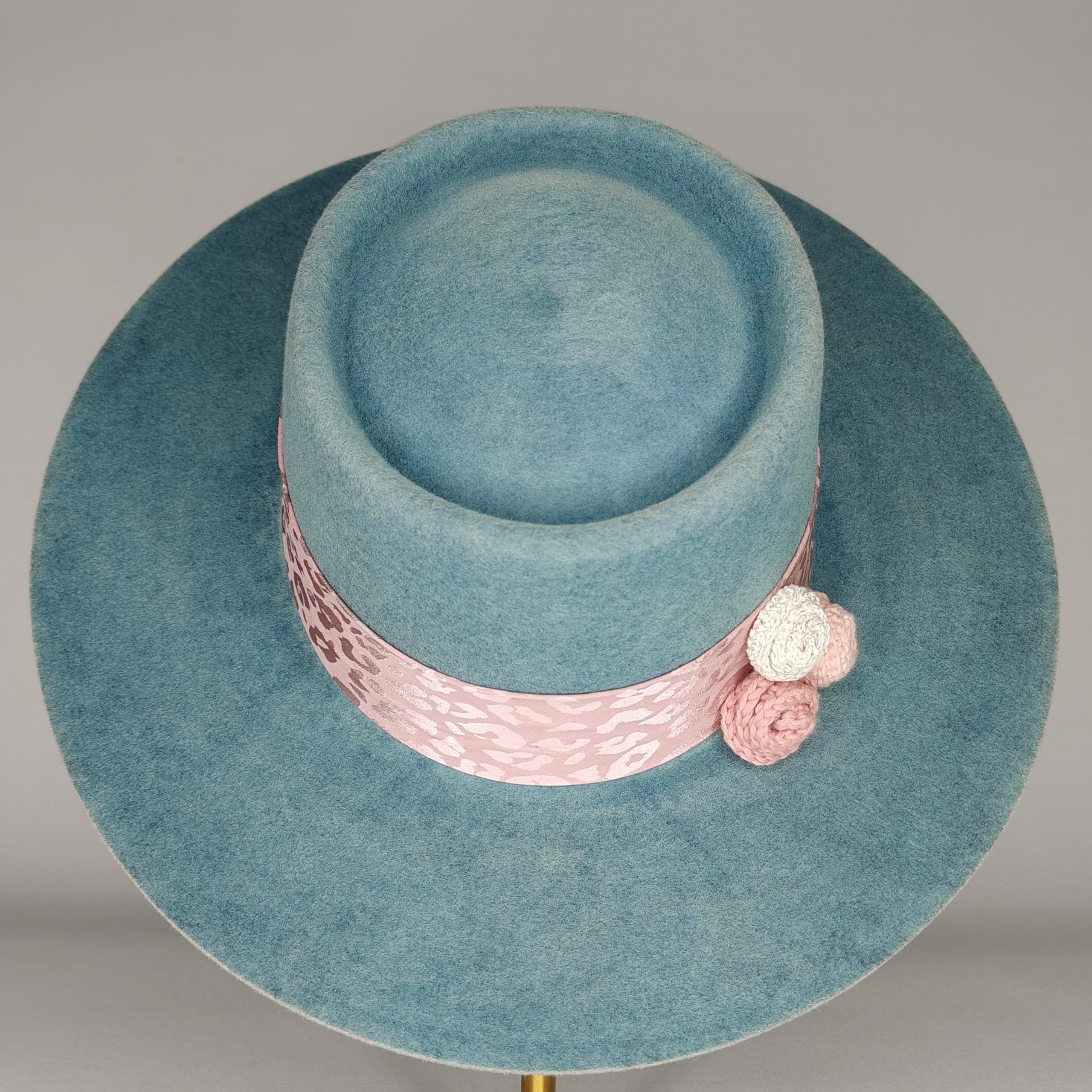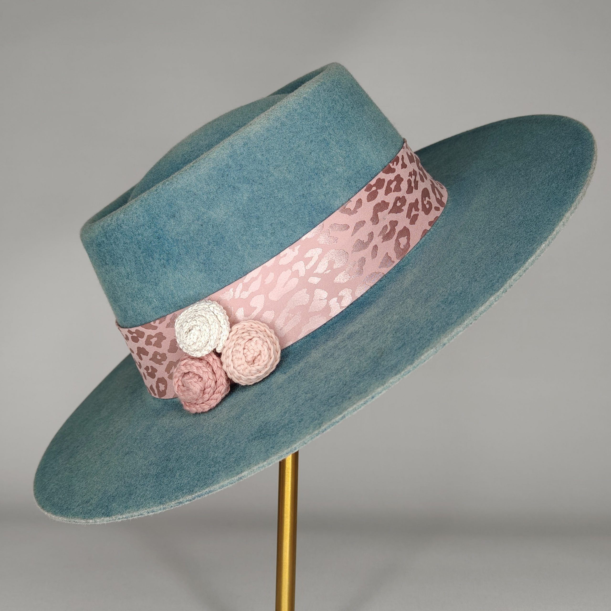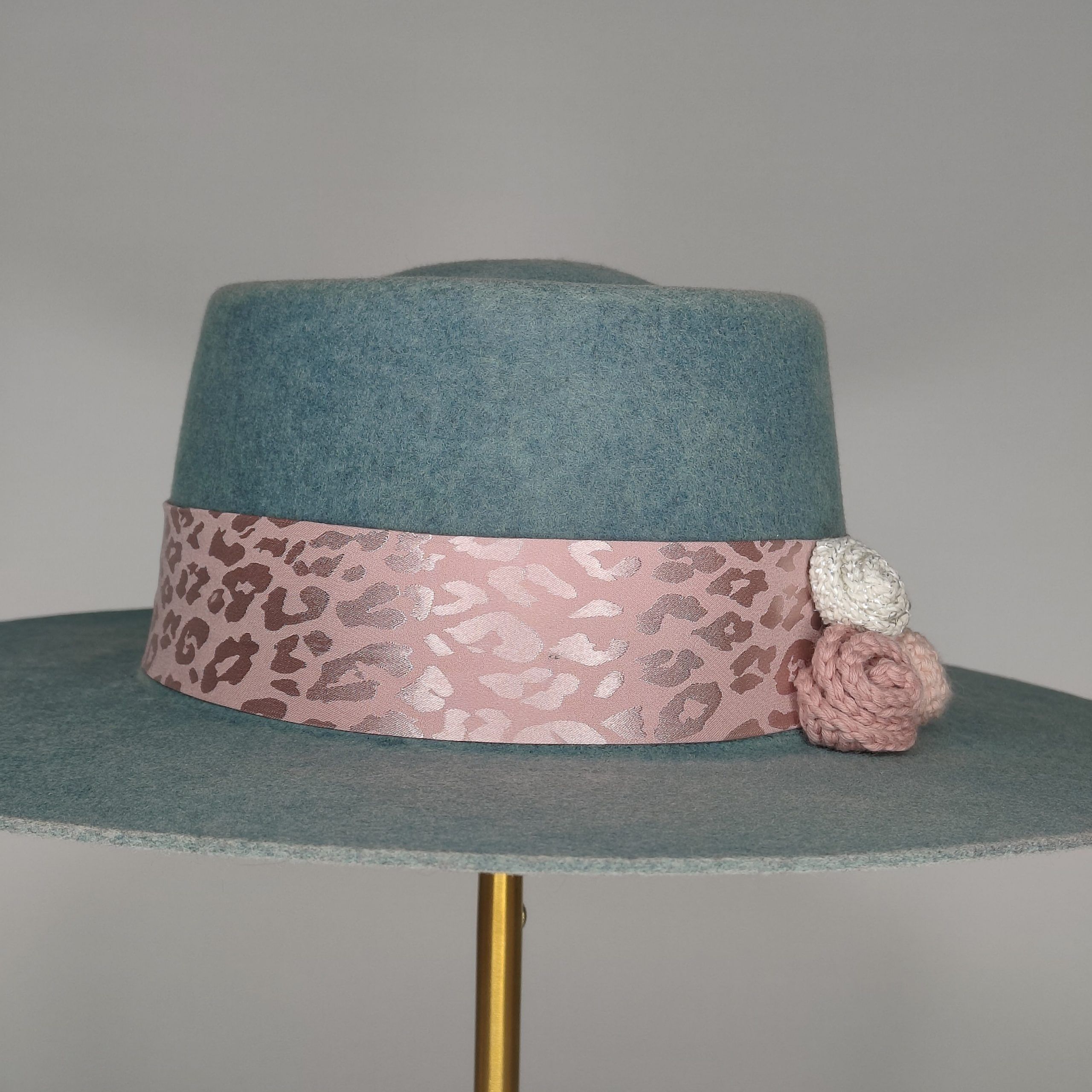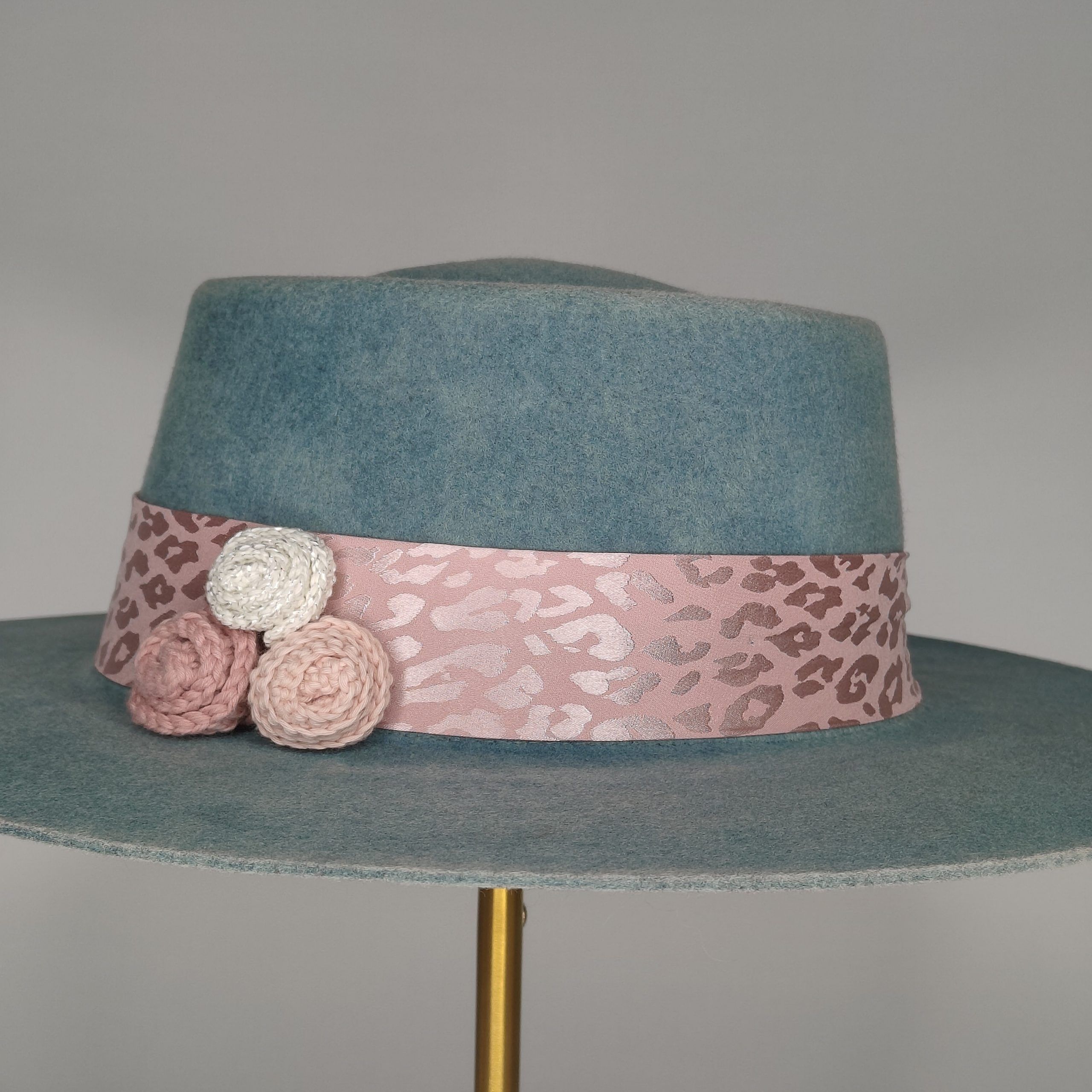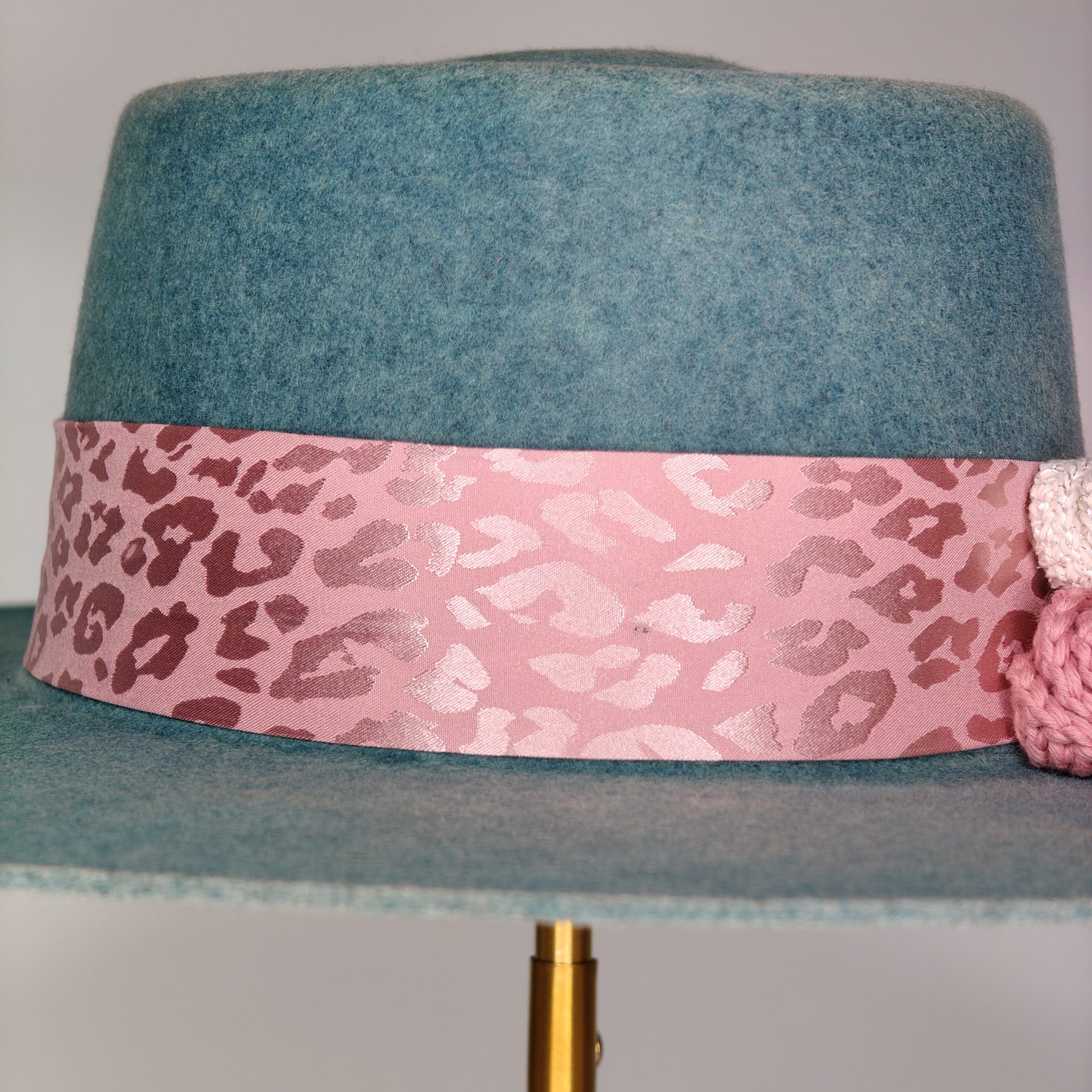Color degradado azul turquesa decorado con cinta animal print rosa y flores de crochet hechas a mano.