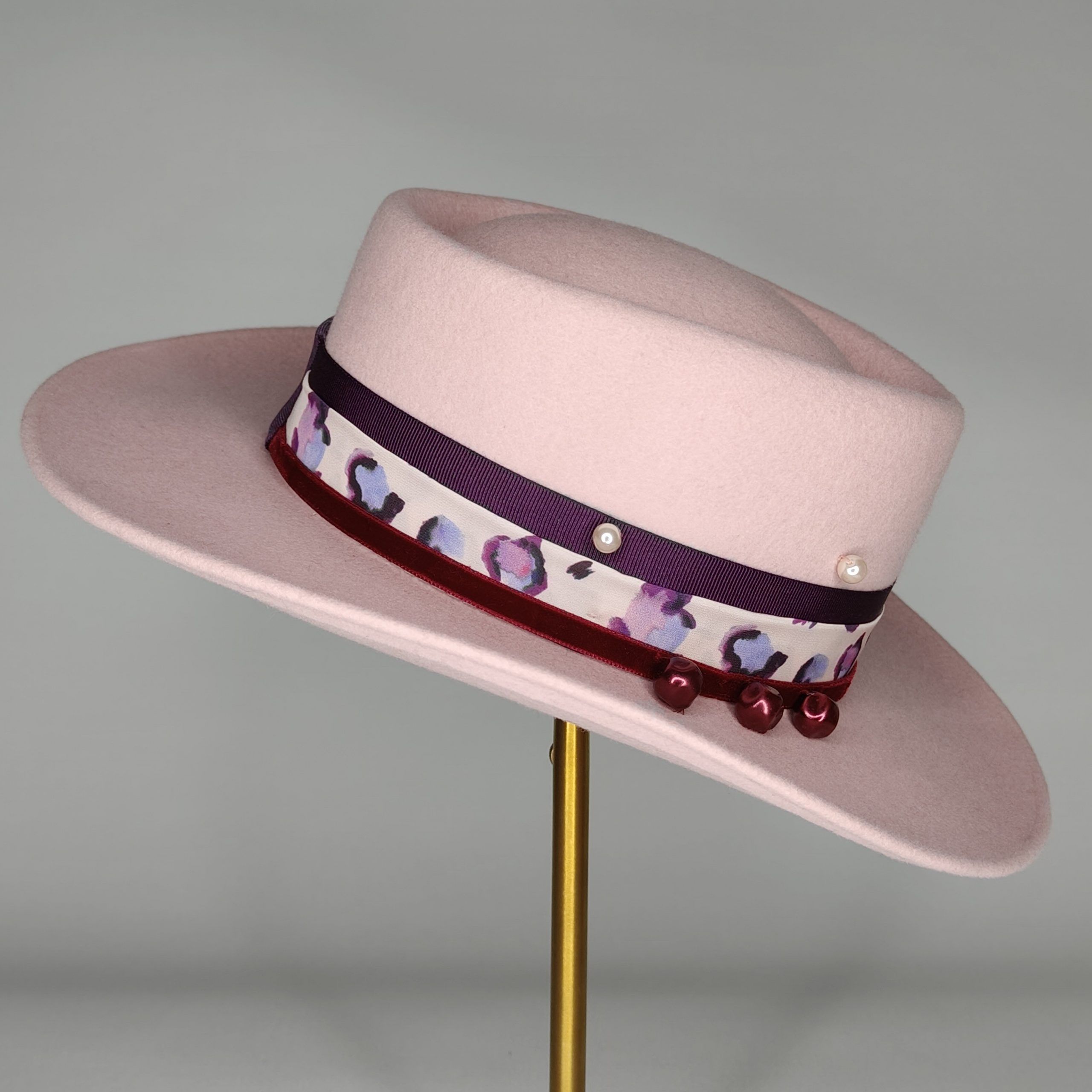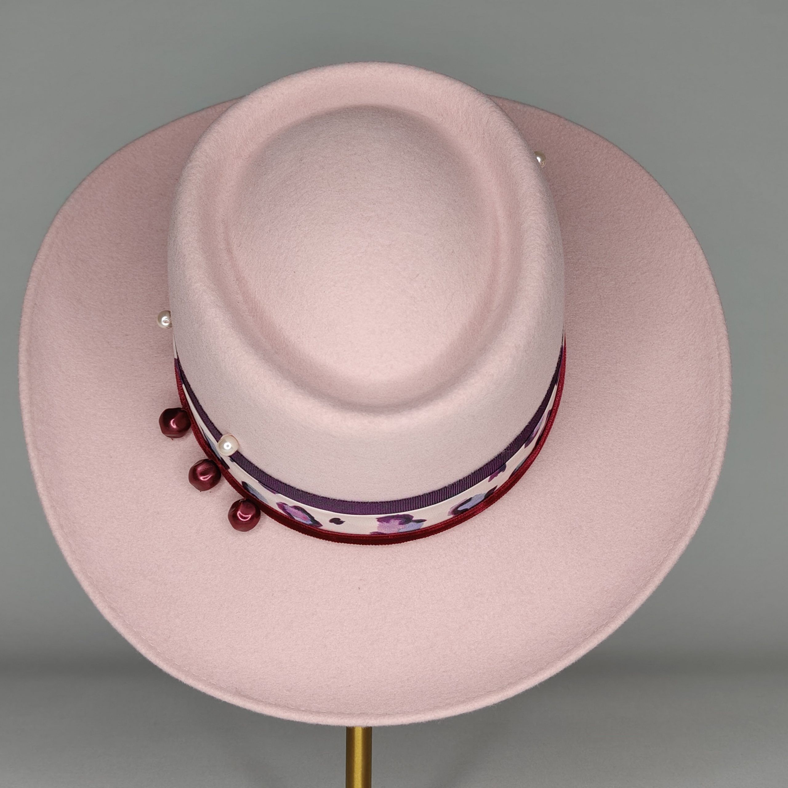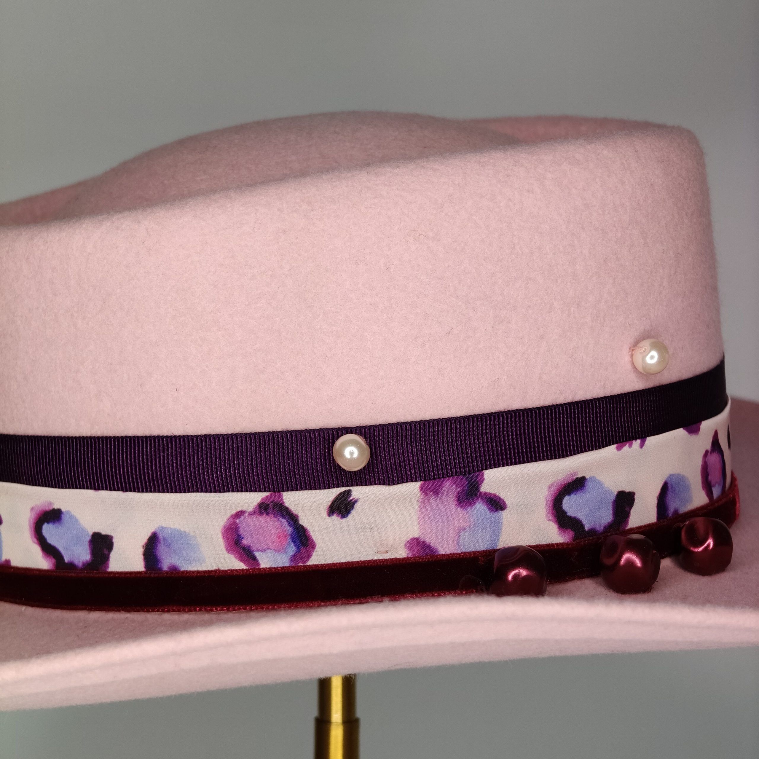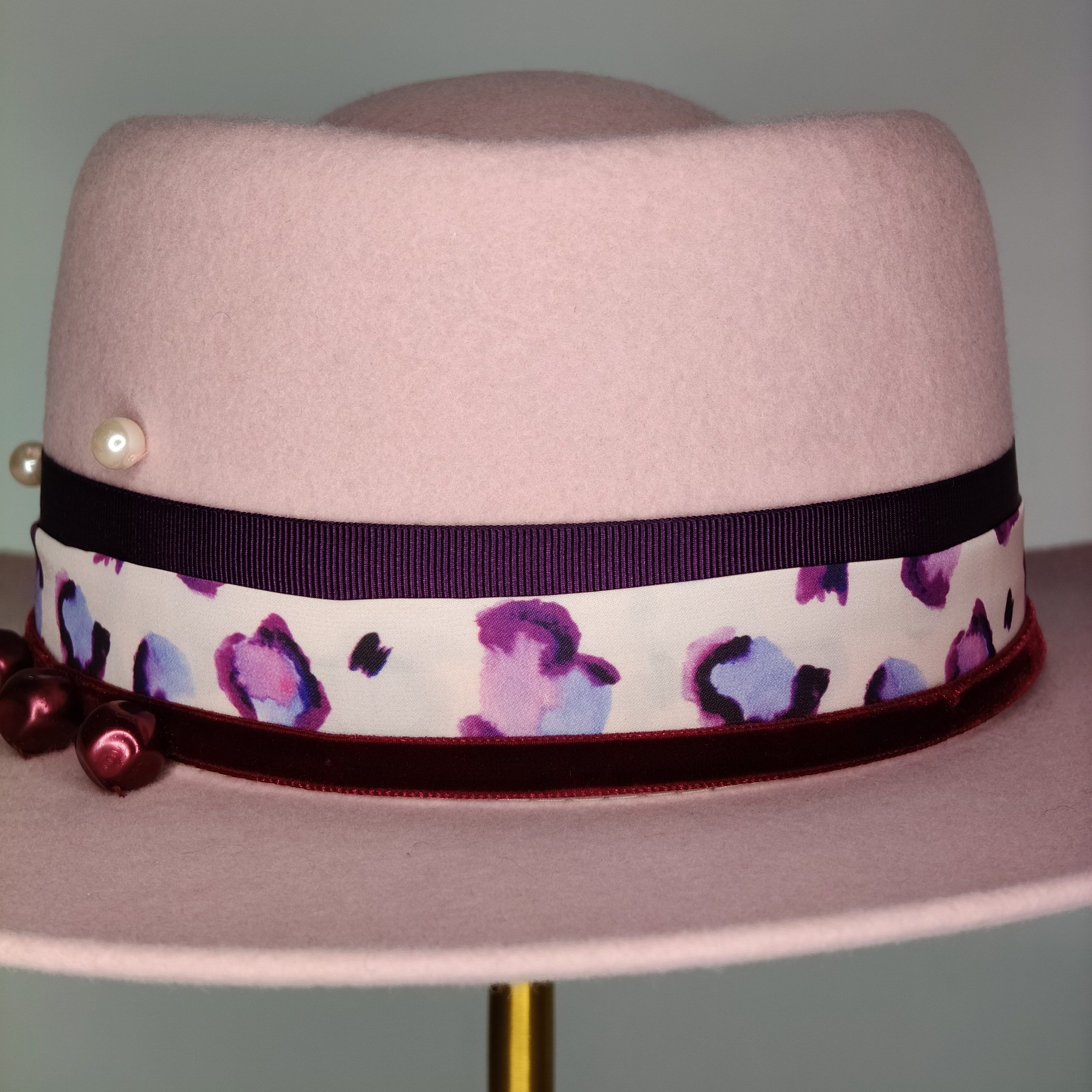 Color rosa y decorado con combinación de cintas y perlas en tonos violeta, lila y burdeos.
