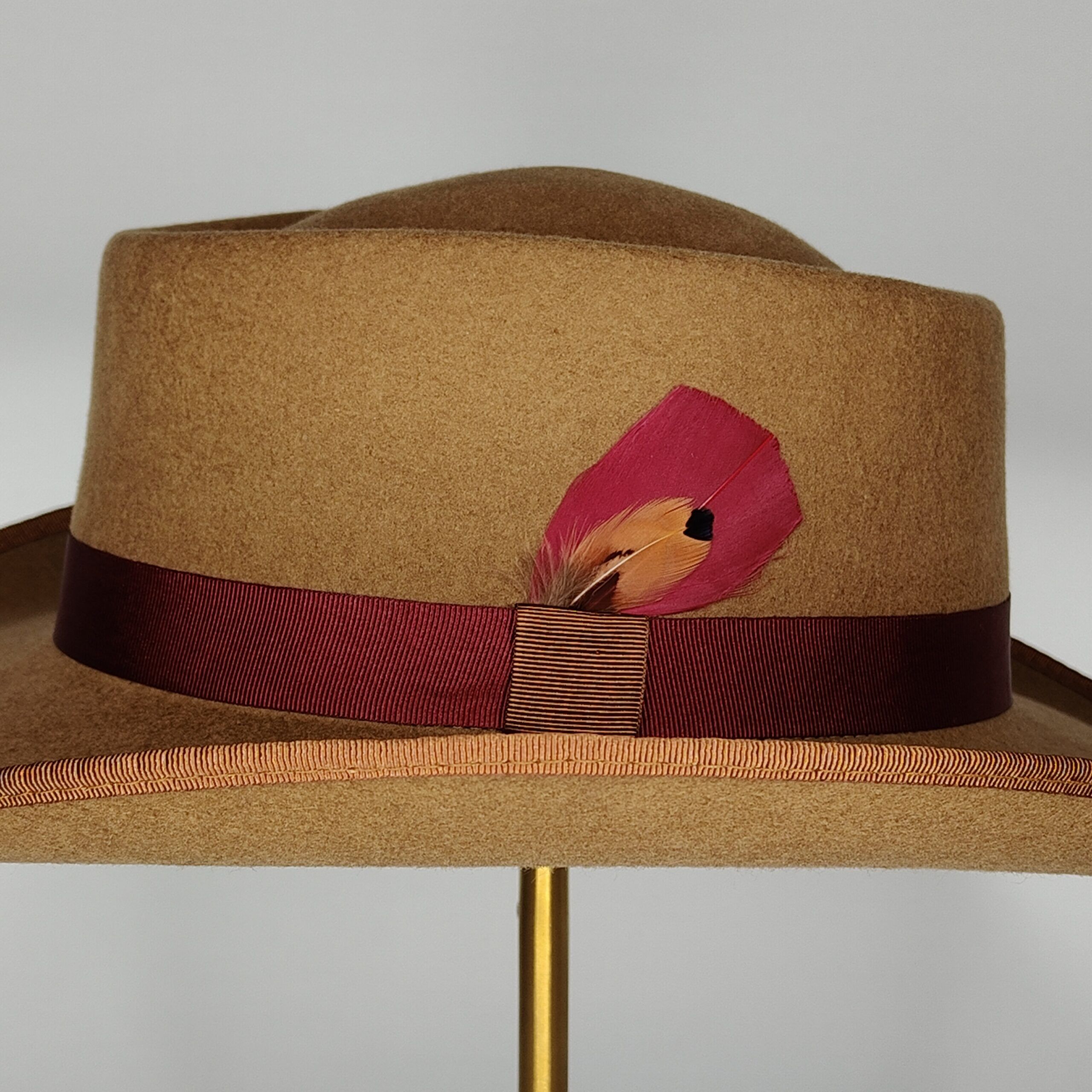 Color camel con cinta y plumas en colores a tono y burdeos.
